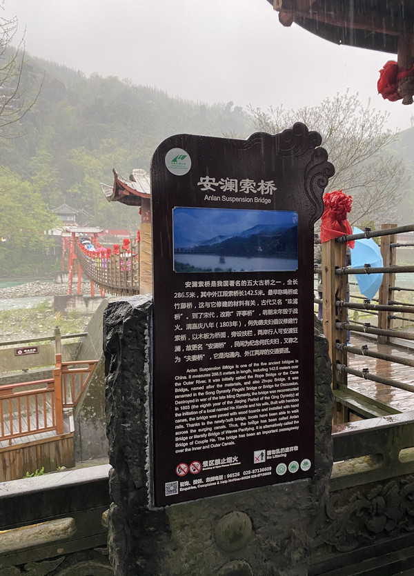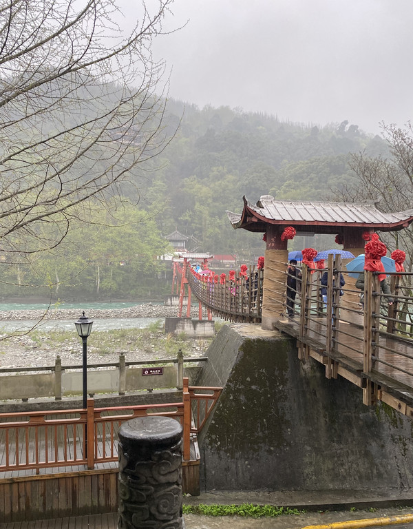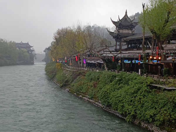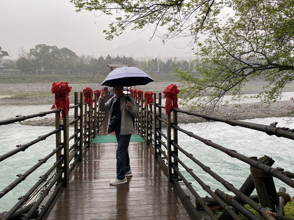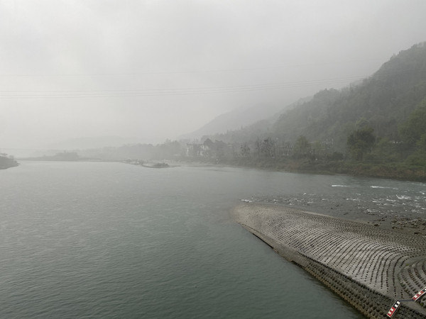 在都江堰景区鱼嘴处天空是下着瓢泼大雨,出都江堰景区过灌县古南桥、古城时雨才逐渐小了点。然现途经阿坝汶川时,雨已逐渐地停了下来,且公路两边的大山间到处是云雾环绕,山水之间景色宜人。