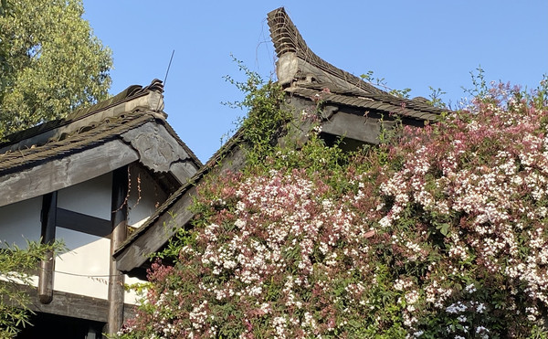 路边山丘上山里人家的茅舍与野山花,朴素而美丽!