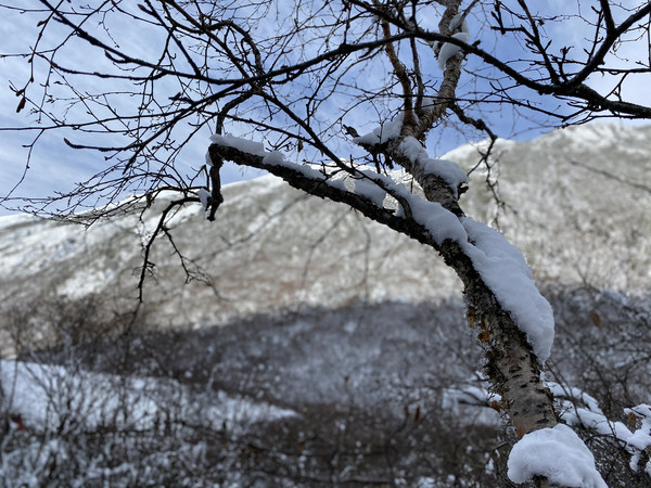 山上的皑皑白雪配上堤岸边枝干上零零落落的红叶,这季节都不知如何去辨别了。