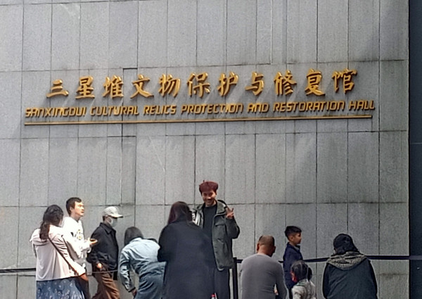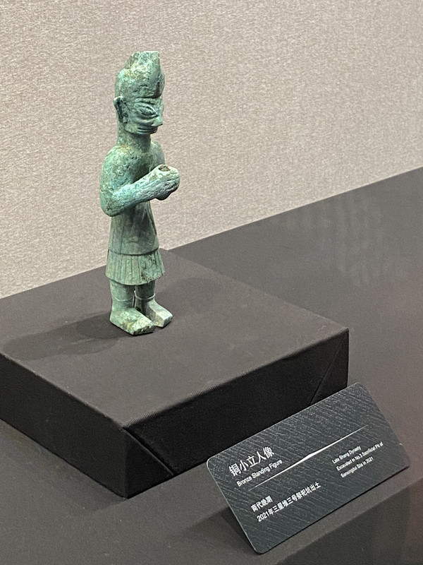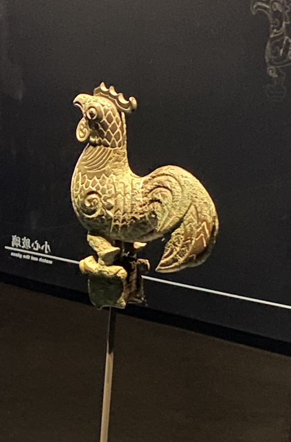 青铜馆内的商青铜鸡!该铜鸡圆润丰满,引颈昂首,极为生动。因其制作风格颇为写实,与三星堆众多造型夸张的文物形成鲜明对比,所以它也是三星堆最具代表性的作品之一。