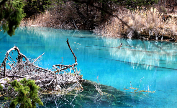 五花海是九寨沟色彩最丰富的海子,主要是因为湖底的钙华、藻类、水草、枯树在对光的不同反射与折射下,加上蓝天、白云、绿草、翠林在湖中的倒影,构成了土黄、翠绿、雪白、蓝绿、海军蓝墨绿等色交织于湖水之中。这是我此行最喜欢的一个海子。