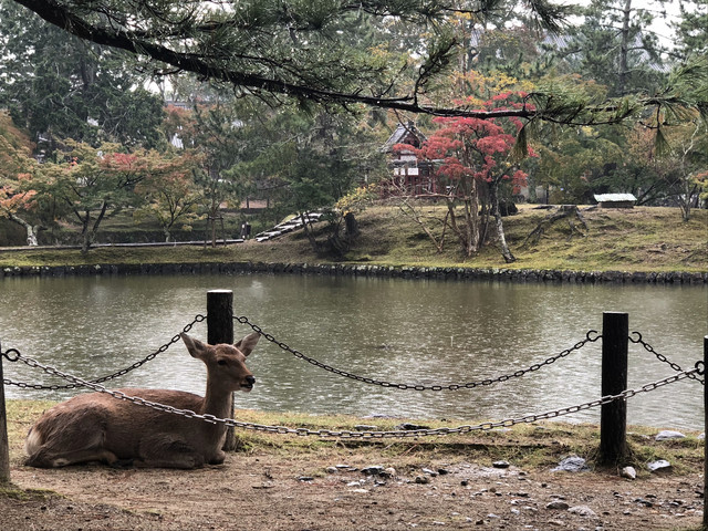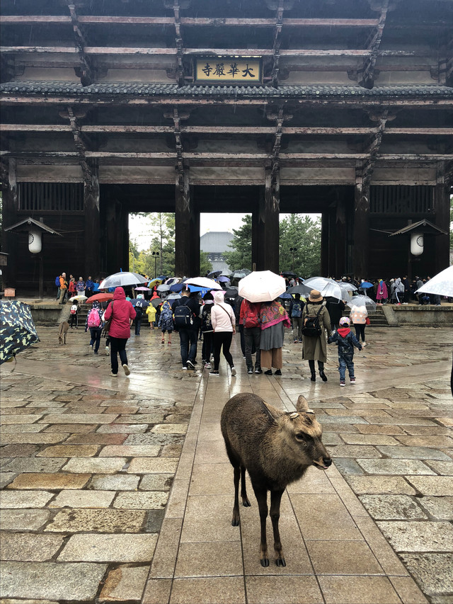 虽然小鹿乖乖的样子,我和K同学却都不大喜欢去逗弄它们,主要是它们随地大小便,整个东大寺到处能见到便便,加上被雨水稀释四下里流动,走到哪里都是一言难尽的臭烘烘。