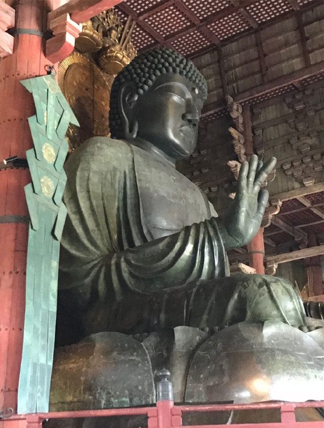 照例我是不会在殿堂内拍佛像的,所以借个网图说明。被战火毁损的卢舍那大佛在殿堂的残垣断壁中,被风吹雨打百多年之后,终于在高德大僧公庆上人的奔走之下,得以在元禄五年(1692年)完整修复。十几年后,大殿也复建完工,据说当年大佛的头部和手指均遭到损毁,仔细看也能发现还是有点点颜色区别的。卢舍那大佛的佛像,当年我在洛阳龙门石窟便是一见倾心,对此念念不忘,据说这里的大佛像还真是与龙门的那尊颇有渊源呢。