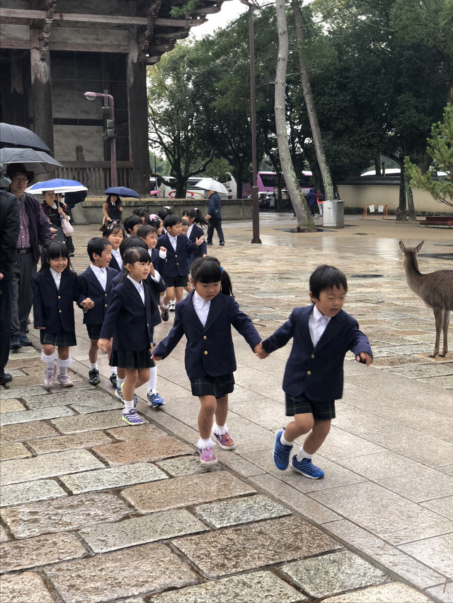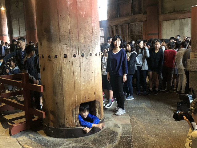 除了庄严宏伟的佛像,殿后堂有根大柱子也很有故事。据说柱子下方的孔洞刚好和殿内所供奉的卢舍那大佛的鼻孔一般大小,能从洞中钻过去的人,就会得到大佛的庇佑,福寿安康什么的。洞并不大,据我目测,成人的话,估计要比较瘦的人才能完成吧。当时刚好赶上一大波修学旅行的日本小朋友们,安静地排队等待着……