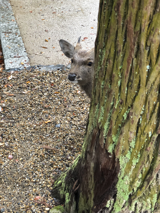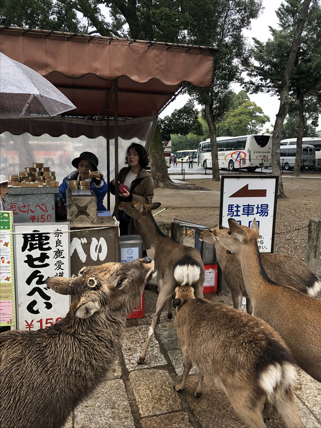 等其他团友的时候,我仔细地观察了它们一阵。小鹿们不吵不闹地围在它们的食堂——卖鹿仙贝(一种小鹿爱吃的饼干)的摊档前,会非常耐心地等着游客付款和数着找赎的零钱。然而一旦有人拿起了鹿仙贝,它们就立马儿发起总攻,冲上去连顶带咬的,无视那些被吓得尖声大叫的女生和吓哭的小孩子,直扑主题——鹿仙贝!我忽然就想起“小鹿乱撞”这词,原来是这样啊!哈哈……