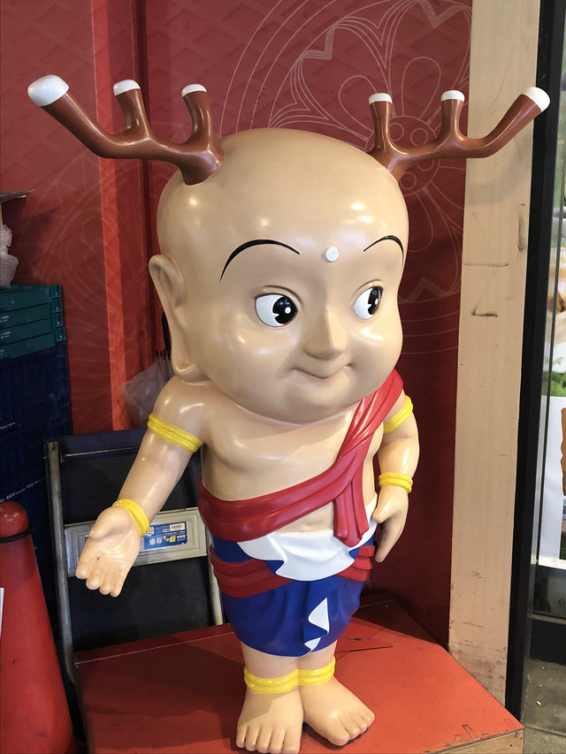 这是代表奈良的吉祥物小人偶,是长着鹿角的萌萌的小菩萨。特别一提的是:在我认知中佛像眉心的一点大都是红色的,是代表吉祥之意。但是知子小姐告诉我,其实正确答案是和这小人偶一样,眉心正中是一根右旋右绕的长约一丈五尺的白毫毛发,而这正是佛祖的三十二法相之一。(我当时就百度了一下,中国也是一样的说法,只是我孤陋寡闻而已。)