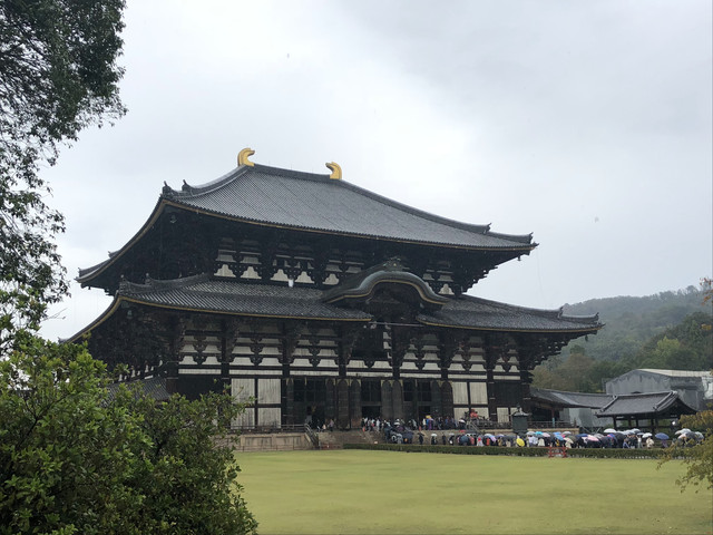东大寺大佛殿,真的不要更气势恢弘了。这所现存木质结构当世第一的建筑,始建于1200多年前,由于耗资巨大,几乎造成了当时国家的破产。几经战火,东大寺大佛殿与殿内的卢舍那佛像均未幸免躲过被摧毁的劫难,现在我们所看到的建筑为1709年复建的,规模仅为当初的2/3。