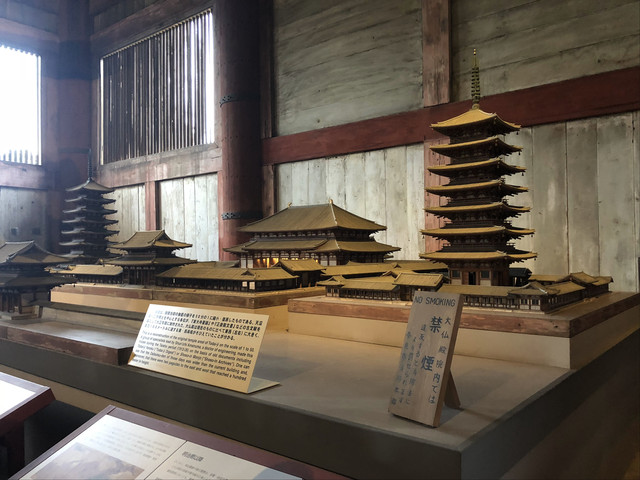 大佛殿里游人如织,乱糟糟的,根本也静不下心细看什么。这组模型是根据古文献的记载,复原了最初的大佛殿的样貌。说明牌上介绍说始建时的殿堂,规模比现在还要大一些,并且东西100M处还各有一座佛塔与之相连。