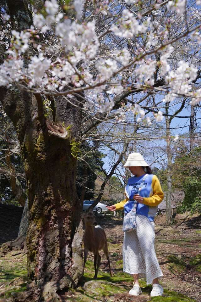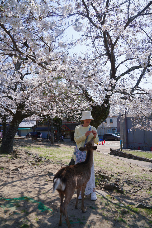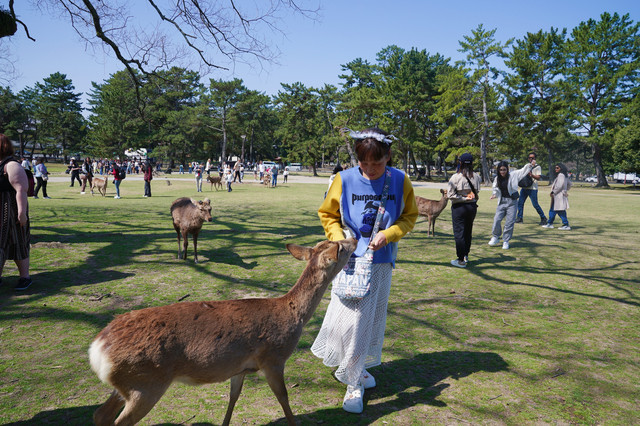 步行到日本桥,乘坐私铁近铁奈良线。出站就是奈良公园。奈良公园位于奈良市区的东侧、春日山脚下。公园中一年四季景色优美如画,在开阔的草甸上生活着成百上千只野生梅花鹿,公园周围还聚集着东大寺、春日大社等名胜古迹。