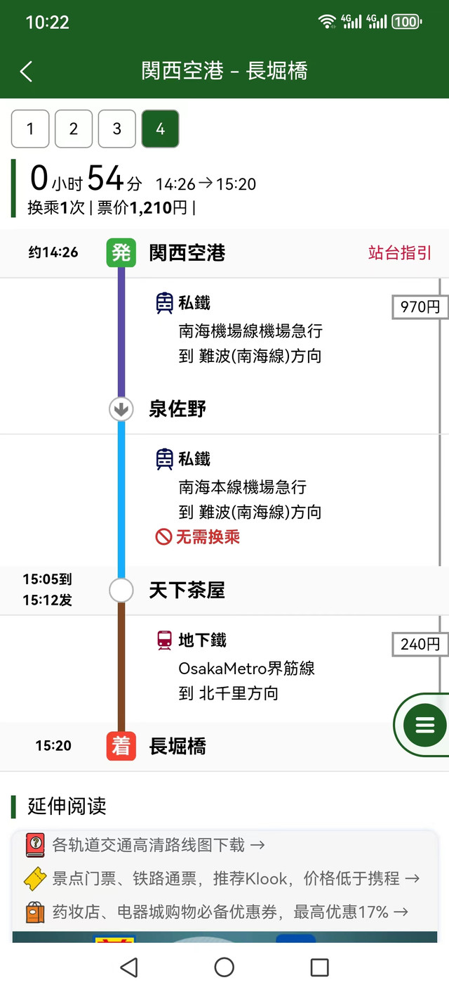 这是私铁+地铁的组合。 你先要乘坐的是私铁的南海线(难波方向)在“天下茶屋”下车。找到南海线的入口,刷卡入内,根据路标找到南海线(难波方向)站台,在日本的好处是汉字标识,能认识。上图的“泉佐野”圆圈中一个箭头,表示不换车,“无需换车”,所以你不需要管他。15:05到达天下茶屋,下车,随着人流,刷卡出,这就完成了南海线的一段;找到“地下铁界筋线”的路标,顺着指示走,刷卡入地铁站,“地下铁界筋线(北千里方向)”站台,看看站牌验证一下有没有经过长堀桥,然后上车,一直到长堀桥下车,刷卡B2口出站。出站就是地下街道,在北3口上台阶(没有电梯),到地面发现酒店就在眼前。全程大概需要1小时。