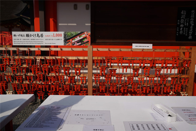 千本鸟居正面并没有字,但是从背面看过去,则是写着来自商会组织、公司、个人的贡献者的姓名以及建造年份。从江户时代开始,许愿的人们捐款在神社境内竖立一座鸟居来表达对神明的敬意,也祈求商业、事业繁盛,壮观的千本鸟居,数量之多真的难以数完。