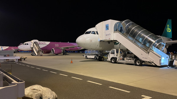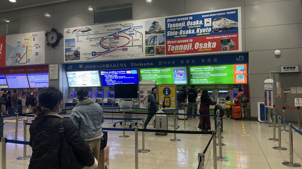 飞机准时到达 关西机场,下飞机随著人流到海关办理入境手续,事先下载好的VJW二维码很关键,和海关工作人员无需对话,递交护照和二维码,通过肢体语言按了指纹、人脸识别后放行。取完行李后再次二维码在机器上扫码,然后通过一个封闭区域就丝滑入境了。我们飞机停T2,一般需要乘机场摆渡车到T1,然后找到购买Icoca卡的售卖机器购买Icoca卡或其他交通票(图中蓝色标识下的售卖机),然后乘地铁或公交离开机场。先期到达的儿子已经为我们买好了Icoca卡,所以直接联系到包车的司机直奔京都的住宿。