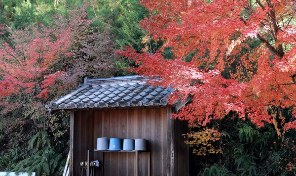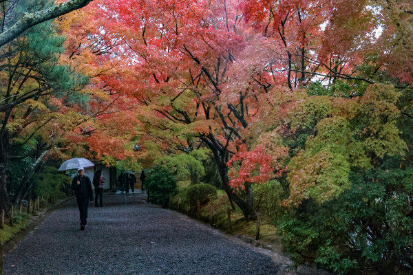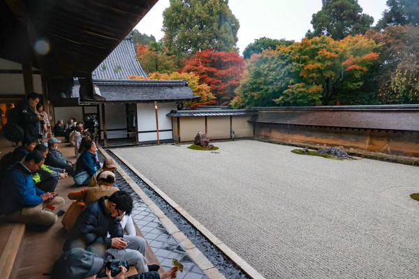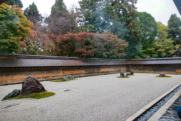 龙安寺是一个小众且地位高的寺庙,说其小众是比金阁寺、清水寺等相比游客可谓极少,适合仔细观赏;说地位高是指其著名的枯山水庭院是 日本 庭院抽象美学的代表,被联合国教科文组织指定为世界文化遗产,所以非常值得推荐。雨中游龙安寺很有味,这并不算自嘲。不同颜色的树叶在雨水的湿润下显得更加鲜艳,坐在龙安寺枯山水石庭观赏雨打屋檐和庭院,禅宗气息分外浓郁。所以不少人就地打坐尽情发呆。所谓枯山水是细沙碎石铺地,叠加错落有致的石块,构成的缩微式园林景观,寓意“干枯的山与水”,以静止不变的元素营造使人宁静的效果。眼前的场景更突出了这种效果,脱鞋进入室内避免了脚步声,坐在屋檐下只听雨点拍打屋顶和树叶的声音,不禁感觉进入另一个世界。雨大已打湿了相机和镜头,回来发现由于镜头沾水,照片上都有水痕印,但目及之处远胜图片,真是不虚此行。一个多小时很快过去,直到暮色笼罩才依依不舍离开。