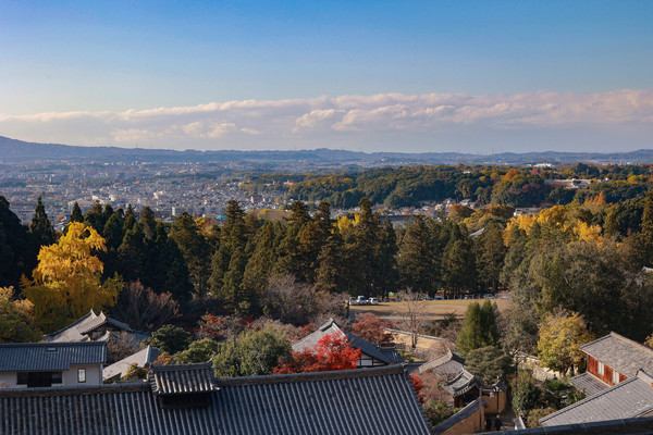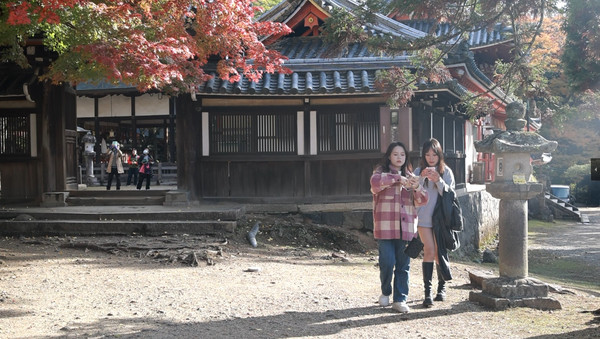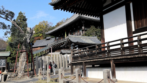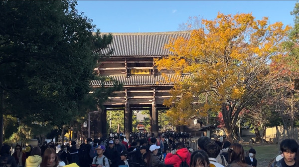 下若草山麓就到东大寺最南面的入口了,通过鸟居规模不大的寺庙神社群,寺庙和神社同在此处为邻,规模较大的是手向山八幡宫被认为是东大寺的镇守神社。出山门有颗古银杏非常漂亮,在往前就是法华堂了。