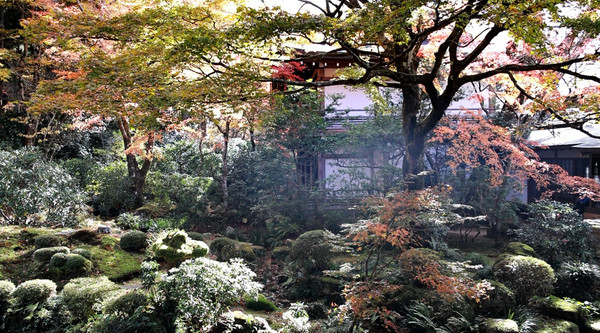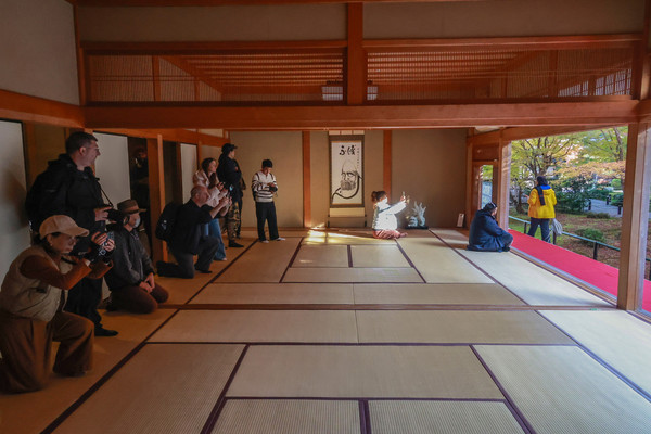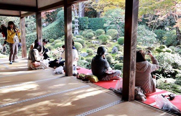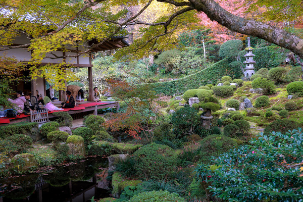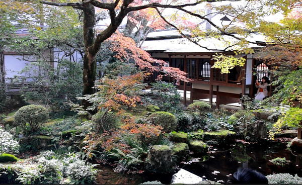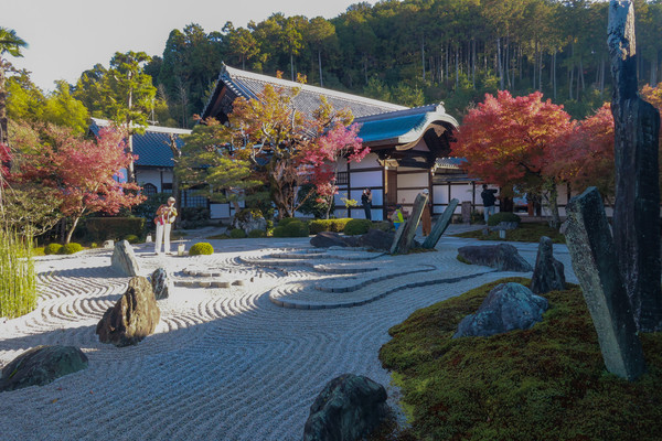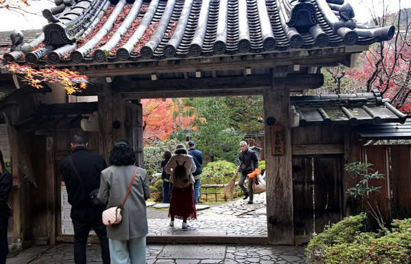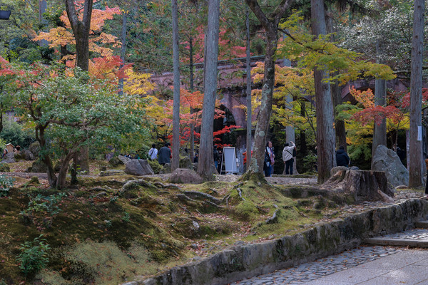 预约参观的两处景点其中之一的圆光寺,车站到圆光寺经过一个住宅区,直到深处可谓曲径通幽。圆光寺由德川家康于公元1601年创建,为临济宗派寺院。也是一座观赏红叶的名苑,可在寺院内廊欣赏满园红叶,所以每次不能接待大批游客。走过小路便是几块枯山水造型,相比龙安寺多了些几何图案,枯石边也多了青苔和绿植,有红叶和寺院衬托已经感受到与众不同。进入寺院内已有人占位拍摄,大家无声而默契相让,流出空位捕捉廊外各种树木带来的光影。渐人多这样的空隙就少,所以尽早入院很有必要。圆光寺后面的园林和山上也是布满枫叶,绕行一圈也花不了多大时间。