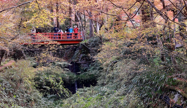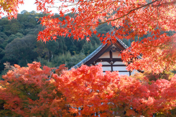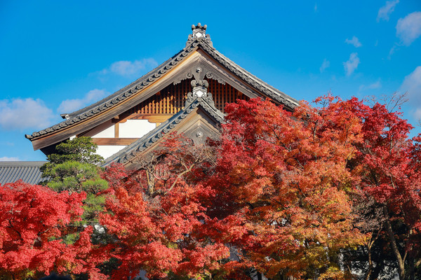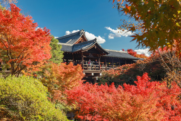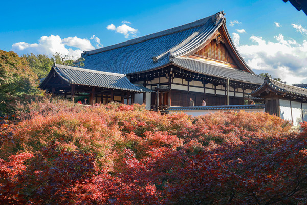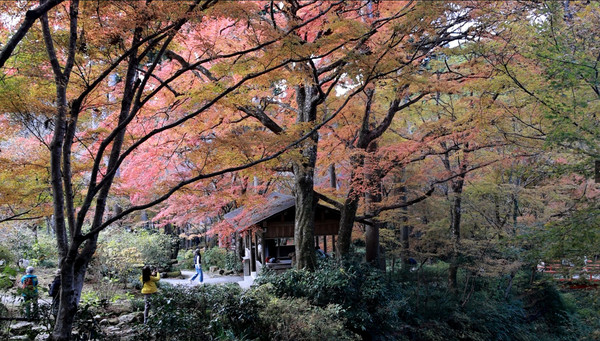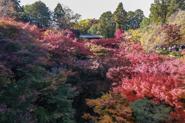 伏见稻荷 大社 到东福寺走小路步行1公里就能达到。东福寺名称是希望比肩 奈良 的东大寺和兴福寺,所以就在那两个寺院名里各取了“东”和“福”两个字。其有四座花园各具特点(需要购买门票),秋季观赏红枫更是这里的一绝名为通天桥景区。秋季平时不买门票的景区却买1000円/人,不过进入景区,就被这里的枫叶惊艳到了,难怪有“ 京都 第一赏枫名所”美誉。由于正值枫叶变色初期,绿色、黄色、红色构成美艳动人的世界,拾阶而下遮天蔽地的枫叶仿佛将人裹挟其中,谷底的小溪呈红色流动状态,景随人动。美景让人忘却了移步,以至于工作人员不停用喇叭喊话,意思大概是请游客不要停留以免拥踏。通天桥是景区的观赏枫叶的最佳位置,站在廊桥上放眼望去卧龙桥下红黄绿各种颜色不同的层次尽收眼底,无愧 京都 市区最佳赏枫地。