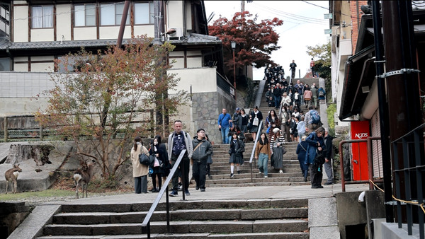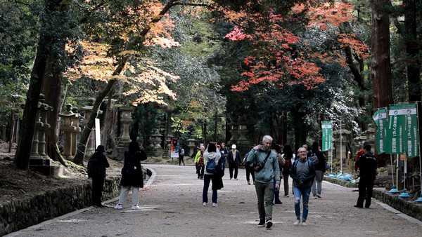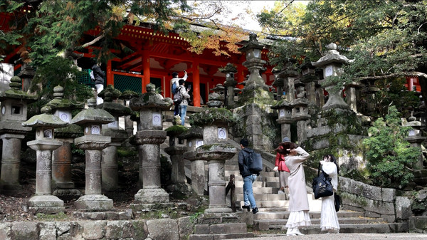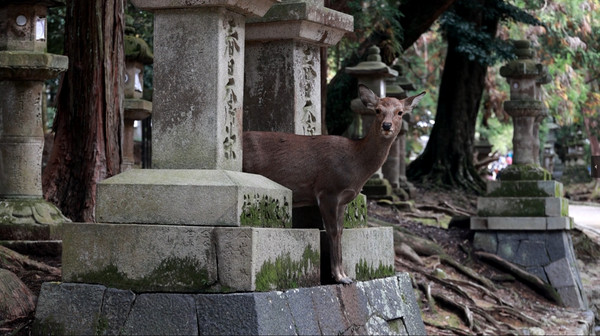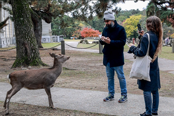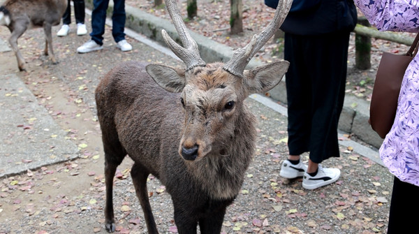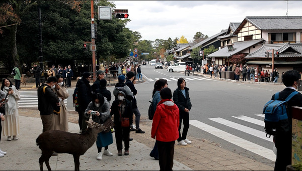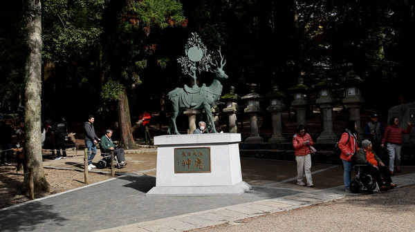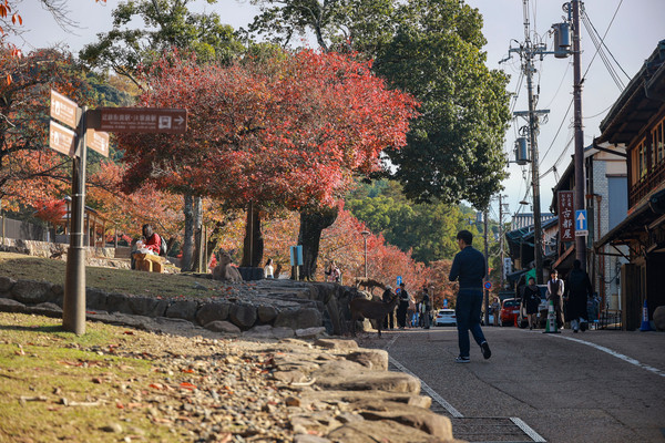 当地人认为鹿是居住在神社和周围山林的神道教圣灵的圣使,被奉为神鹿。散开在路边的鹿或不时向游客点头讨要吃的或悠闲散步,一派人与动物和谐的生态场景。