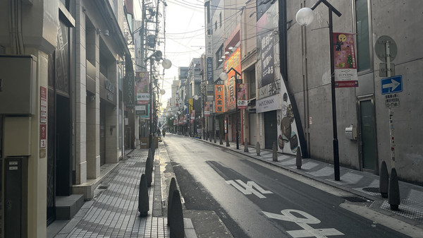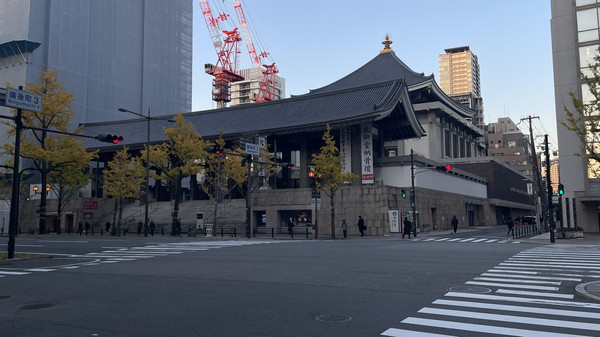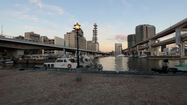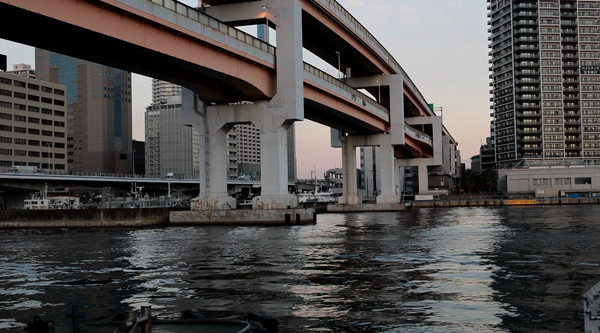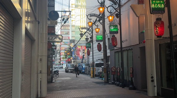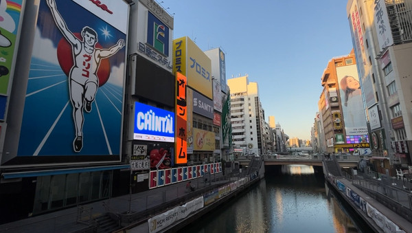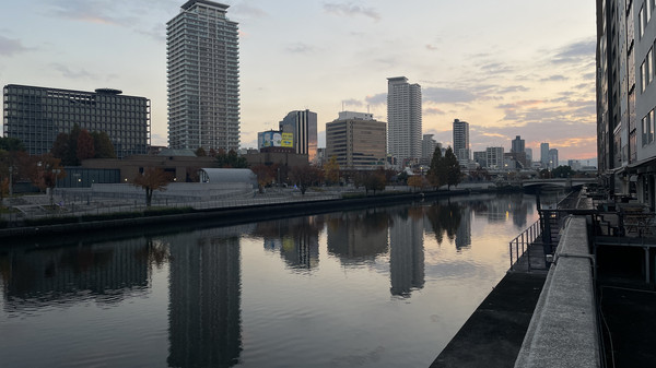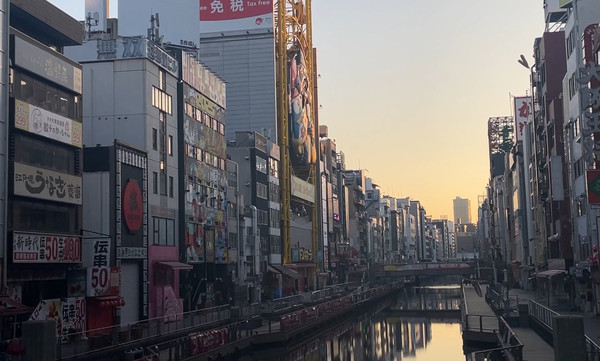 清晨行走在 大阪 的街道上,朝霞染 红河 面。