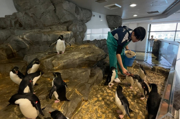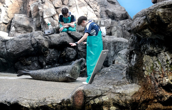 上午搭乘地铁到天 宝山 海游馆,1990年建造的海游馆,号称世界上最大级别的水族馆。馆中心是9米多深的水槽,以拥有巨大的鲸鲨闻名,自动扶梯到8楼然后沿螺旋步道向下,参观各种海洋水生动物,途中还有不少打卡点,供孩子们盖章。