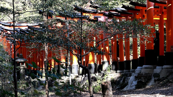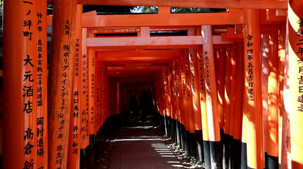 日本 所见的寺庙起源于 中国 和 印度 ,供奉释迦、观世音等佛,而神社是 日本 的传统宗教“神道”,供奉着河流、山岳、树及其他各种神。神社的入口都有漆成鲜红色或橘色的鸟居,由两根柱、柱上的笠木和岛木、插入两柱间的贯三部分组成,主要用以区分神域与人类所居住的世俗界,算是一种结界,代表神域的入口,可以将它视为一种「门」。千本鸟居由许多工商团体会为还愿而建,所以每一个鸟居的背面都刻建造年份和商社的名称。这里的鸟居绵延好几公里直到稻荷山上,阳光透过鸟居行程梦幻般的光影,因此这里成了来 京都 必打卡的网红地,貌似千本鸟居比伏见稻荷 大社 更能引起游客的兴趣。如果全部走完需要三个半小时左右,越往上走游客渐少,走到人少处拍照打卡,即可打道回府。