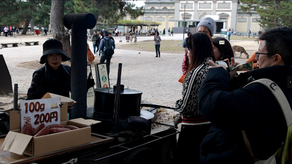 路边有做喂鹿的饼和红薯摊位,供游客购买后喂鹿。