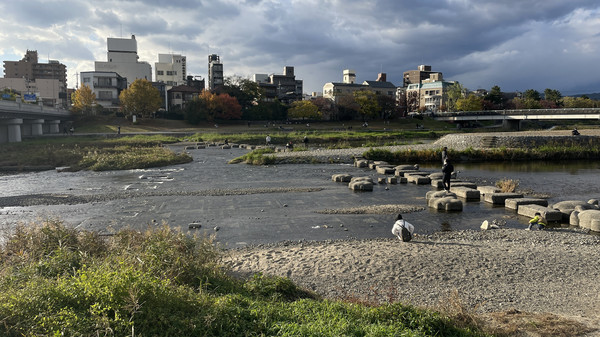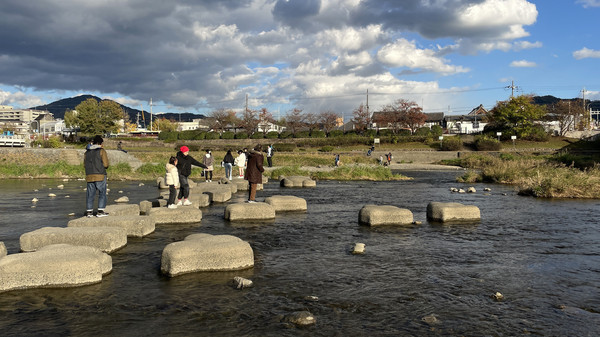 出通天桥后心情仍然久久不能平复,不再游览寺内其他景点,决定赶往金阁寺,这样在儿子回国前能一起欣赏晚霞下的金阁寺。经过鸭川换车,踏河中大石块上跳跃过河,也目睹了鸭川的美景。