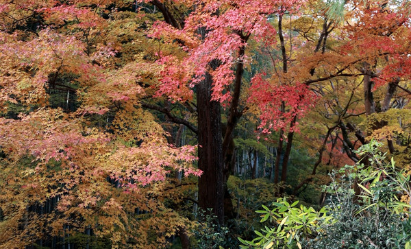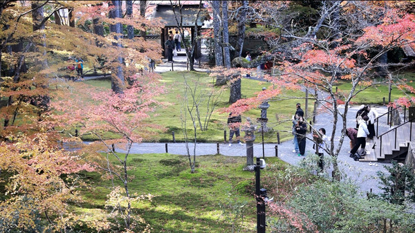 三千院的后山是非常值得观赏的地方,登高俯视草地、枫叶、围墙和路上的行人构成美妙的图画。高大的枫树枝繁叶茂甚是好看。