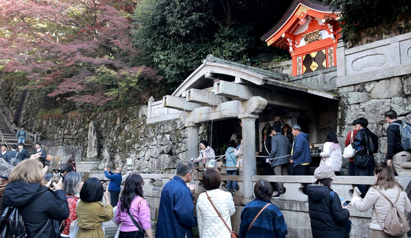 音羽瀑布是清水寺即其清水而得名,有三股清水流出分别代表 长寿 、健康和智慧的美好寓意,获得清水需要排队。