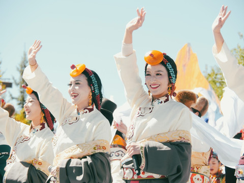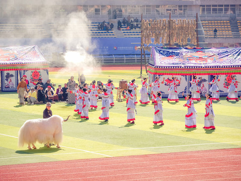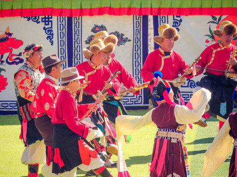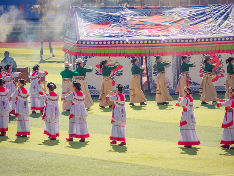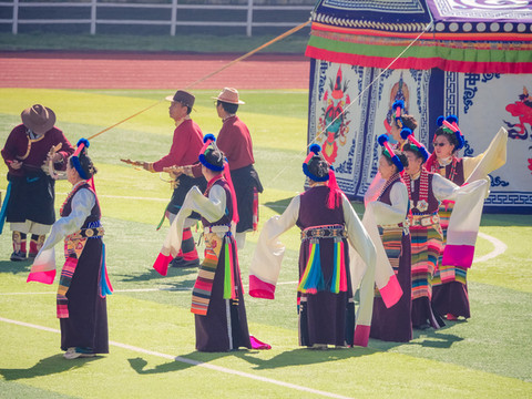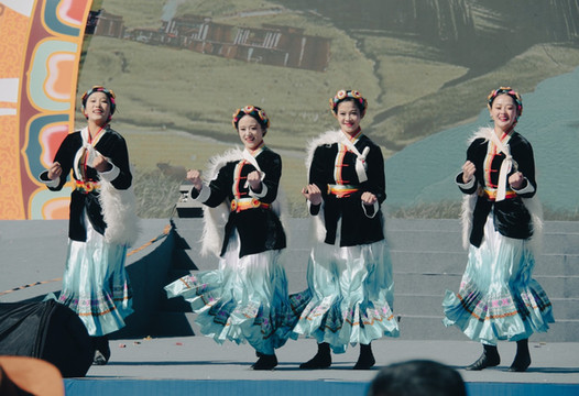 会场中间则是的多民族歌舞表演。来自 香格里拉 周边的各族人民带来了他们独特的歌舞表演,包括藏族、彝族、白族等民族的舞蹈和歌曲。这些表演形式多样,既有热烈的舞蹈,又有悠扬的歌曲,令人陶醉其中。