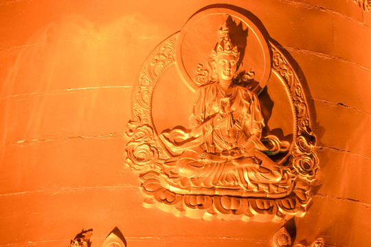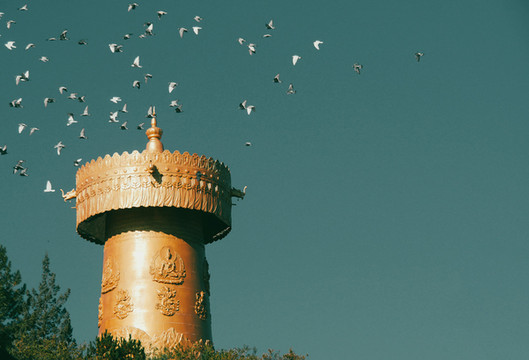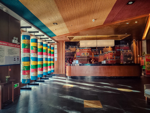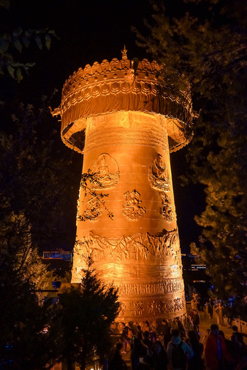 那是一个巨大的金色圆柱形,高达21米,重数十吨,转经筒里面藏有经咒、六字真言124万条。还有各种佛宝16吨。转经筒身是纯铜鎏金,筒壁浮雕四大 菩萨 、 三江 并流、佛家 八宝 、56个民族大团结图案。我试着挤进去,然后和各位游客一起一圈又一圈的转着,仿佛能感受到它所散发出的神秘力量。也感受到了藏族同胞们的虔诚和信仰。