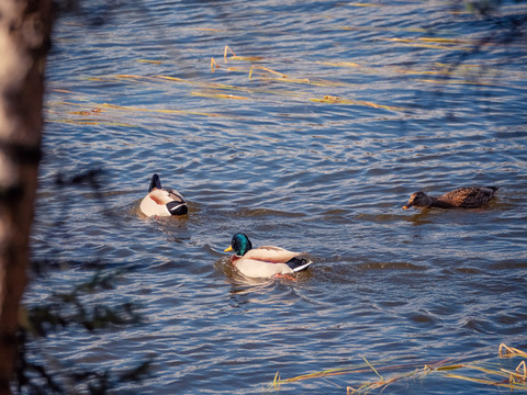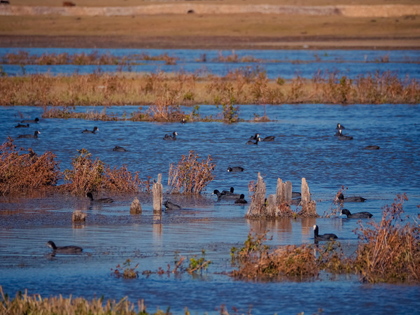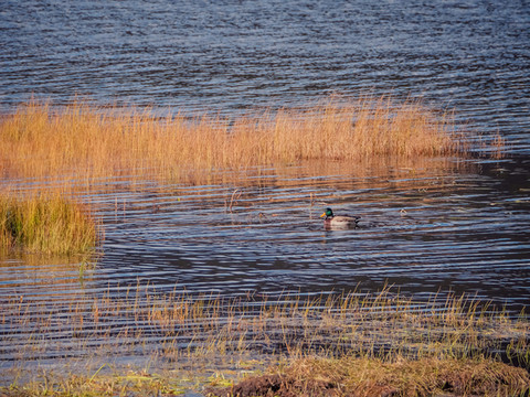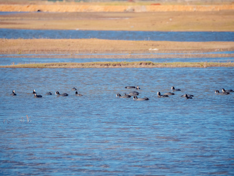 黄鸭和白骨顶鸡则喜欢在湖边的草丛中觅食,它们机警地在周围活动,一有风吹草动就立刻飞起。