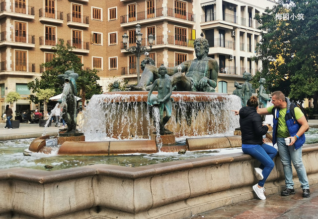 圣女广场还有座著名的喷泉雕像,中间高起的台子上半躺半坐着一位男性雕像,通常被认为象征着图利亚河(Túria River),这是瓦伦西亚的母亲河。男性雕像周围环绕着八位姿态各异的仙女,她们或举或抱着水罐,源源不断地倾倒出清流,象征着图利亚河的八条主要支流。仙女姿态各异,源源不断涌出的清流,激起朵朵水花,颇为生动壮观,这座喷泉雕像的艺术风格独特,无论从哪个角度观看,都是一件精美的艺术作品。广场的和平鸽与游人一同闲庭信步,置身于此,仿佛时间漫流,烦恼消散,令人流连忘返。