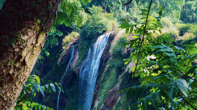 瀑布从百余米的陡崖上飞流直下,特别壮观!站在大瀑布的下方,有清凉的水珠子打在身上,超级凉快!