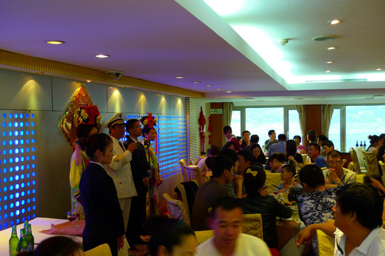 夜幕降临,华灯初上,邮轮上的各种活动开始了。船长在数位古装美女的簇拥下来到大餐厅,参加答谢宴并发表热情洋溢的致辞,一船游客就是一个大家庭,相互敬酒,其乐融融,不亦乐乎。