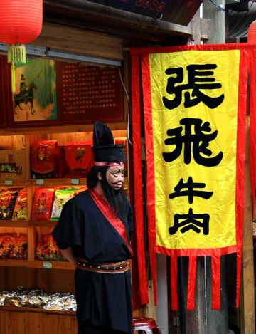张飞牛肉产于四川省阆中市,是具有浓厚的四川风味的特产,重庆原来也是四川的,所以算重庆特此也不矛盾。张飞牛肉表面为棕红色,切开后肉质纹丝紧密,食之咸淡适口,是下酒的好料子,就是门口的真人模特乍一看会吓你一跳。