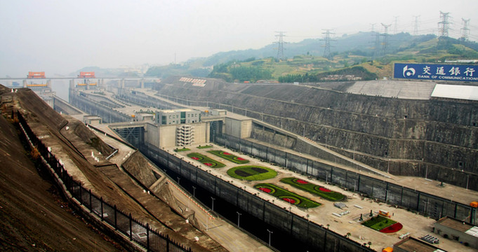 三峡水电站大坝高程185米,蓄水高程175米,水库长2335米,总投资954.6亿元人民币,安装32台单机容量为70万千瓦的水电机组。这是三峡船闸鸟瞰图。