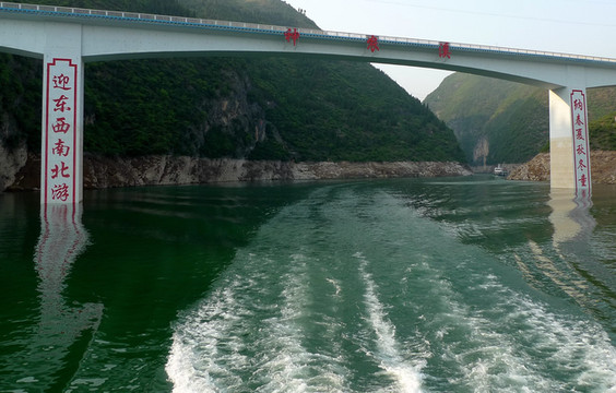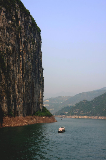 上了岸远距离看夔门,夔门两岸高山翠绿、峡谷夹江,是长江从四川盆地进入三峡的大门。这里江面宽不过百余米,把滔滔大江约束得像一道水沟,而此处每秒五、六万立方米的流量使得江水呈现急流险滩,特别是三峡大坝没建的时候,来往船只是需要领航的。