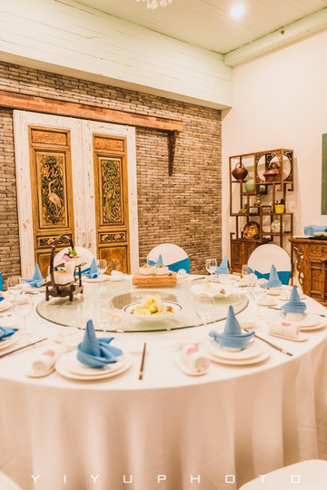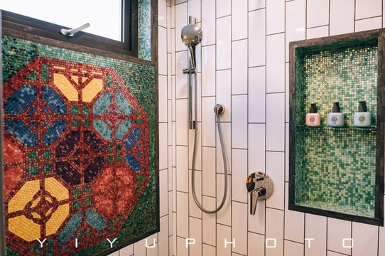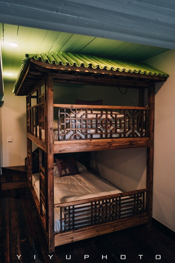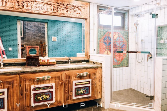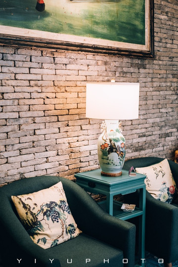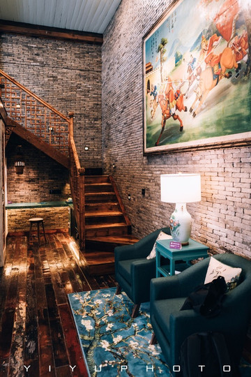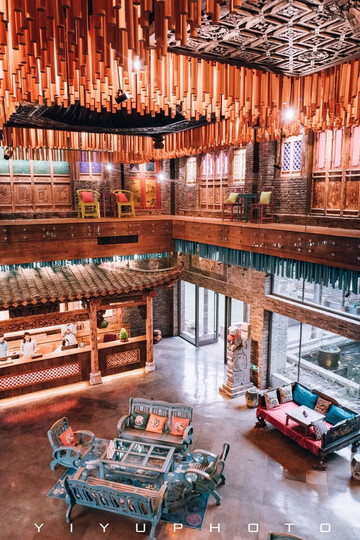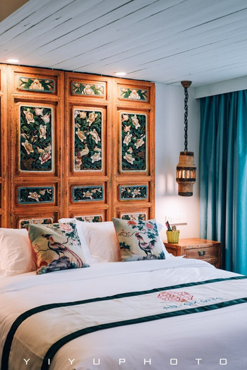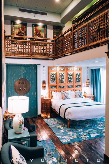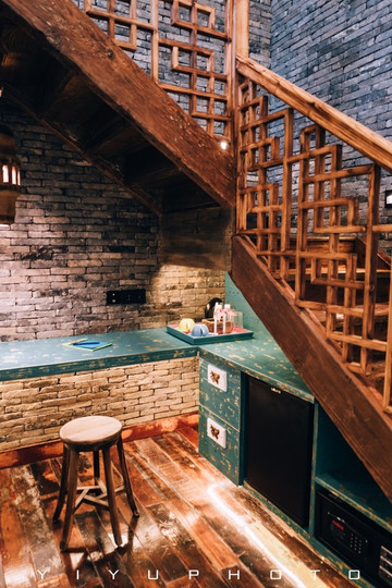 古朴原木色和低调灰砖组成酒店整体的暗色调,明快鲜艳亮色块衬出精致奢华的古董细节。没错,每块古砖、每张桌椅,几乎都是老板从全国各地收集来的古董,宅院深深,古香古色。