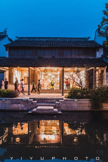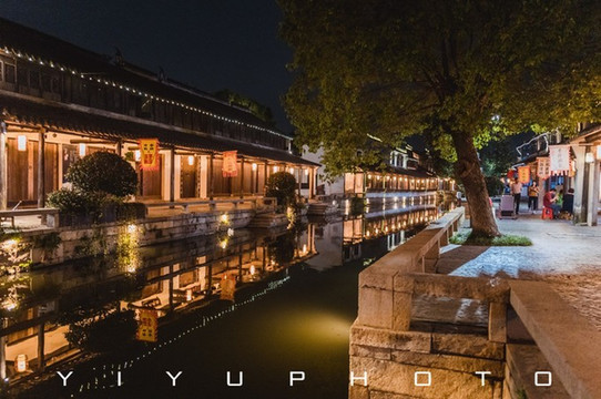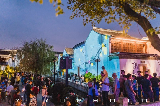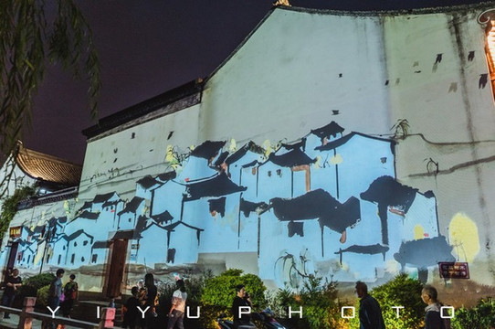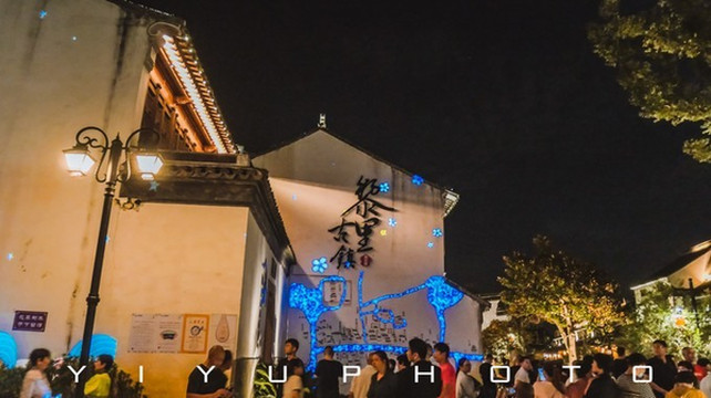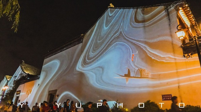 夜幕降临,灯光摇曳,古镇的粉墙黛瓦上悄然展出一场绚丽灯光秀,朵朵梨花、圆月锦鲤、江南风情十足。中秋圆月,熙熙攘攘的人群让古镇热闹起来,流水人家,整座古镇宛若梦境,云雾成仙水汽化羽,摇橹船上的歌女自成一景,沉浸于民谣的浅酌低唱。