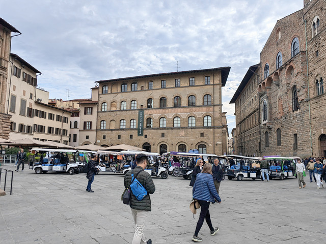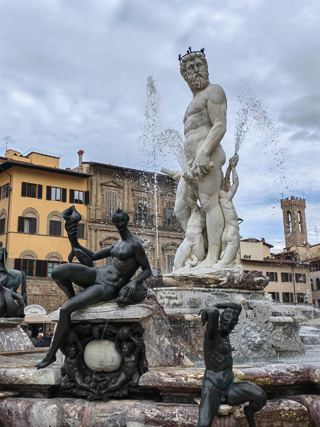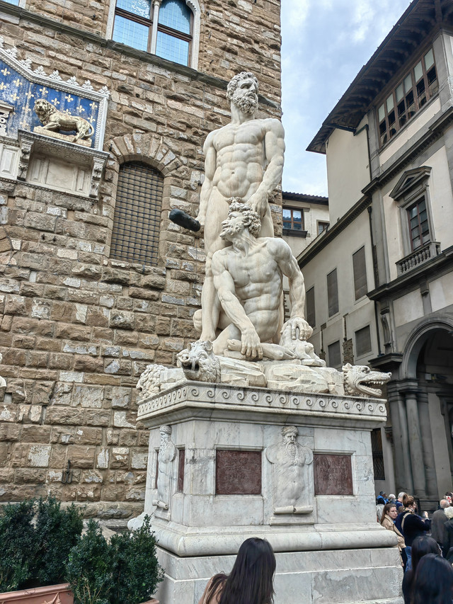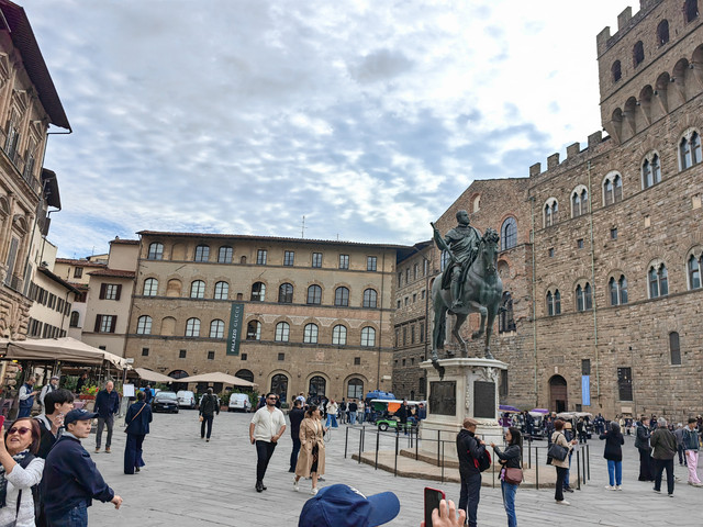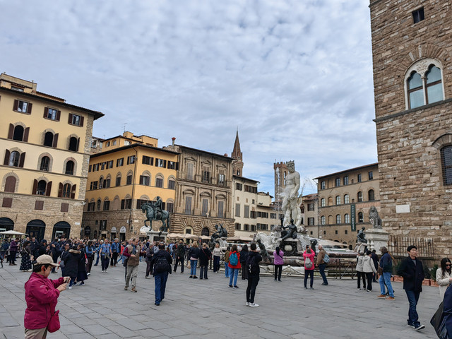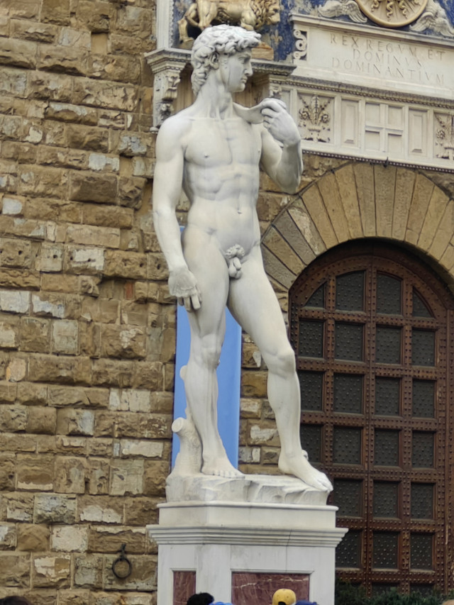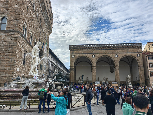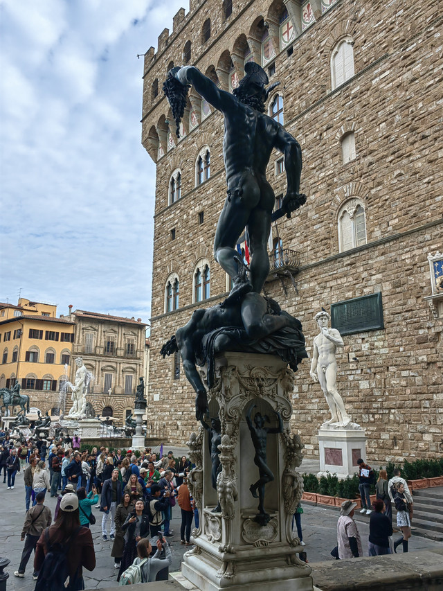 市政厅广场,这里有一座建于十三世纪的碉堡式旧宫(现为市政厅),连同整个广场成为了一座露天雕塑博物馆,各种石雕和铜像作品栩栩如生,如人们所熟悉的米开朗琪罗的《大卫像》复制品。