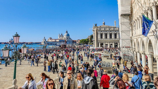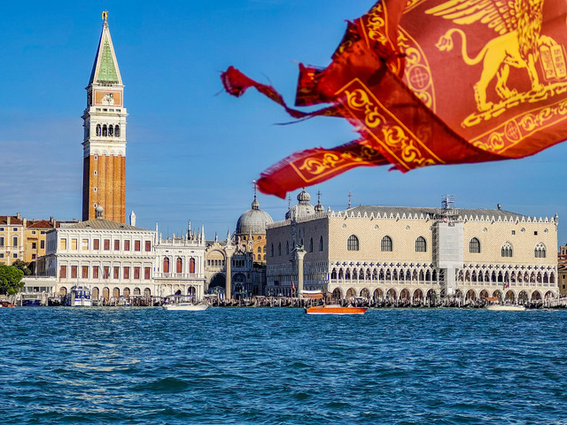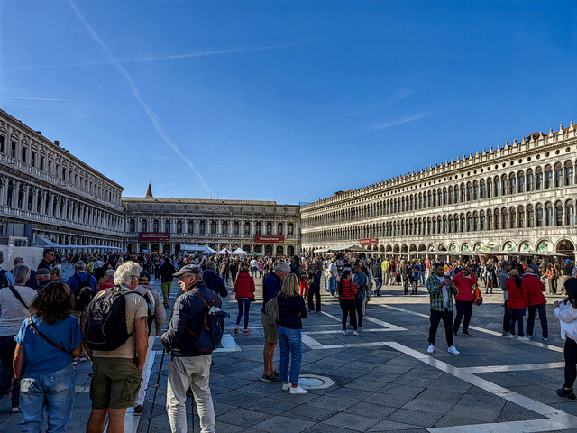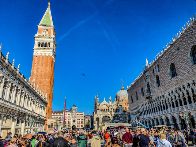 游览圣马可广场,威尼斯地标观景,许多威尼斯节庆选择的举办地。圣马可广场上,鸽子在人群中自由自在地飞翔,人们在广场上漫步、拍照,感受着这座城市的独特魅力。