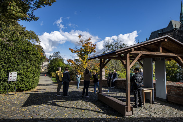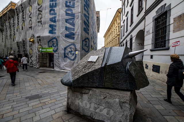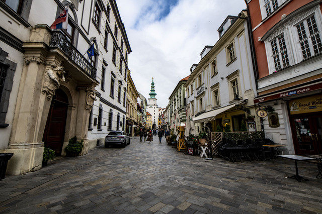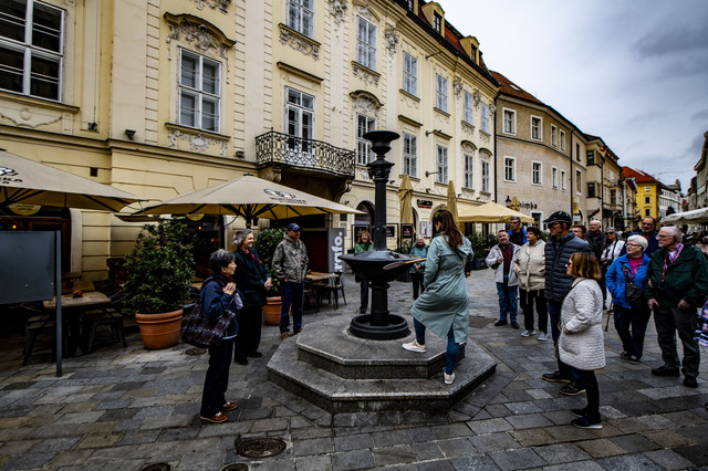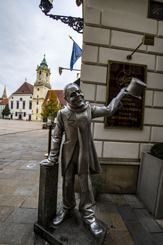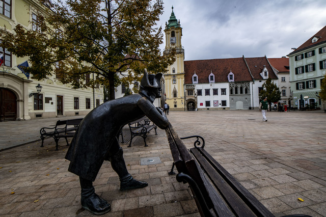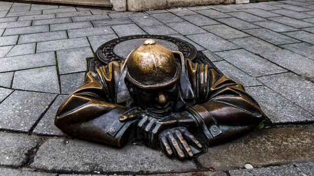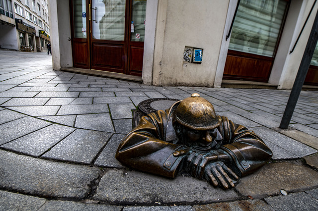 参观布拉迪斯拉发老城广场。著名的“工作中的男人”雕像《水道工吉米》很有点意思,也有人戏称它为“偷窥者”。地下管道工雕像紧贴地面, 是一个只有50公分高的黄铜雕像,行人如果不注意路面,可能看不到它。雕像是一位头戴工作帽的地下管道工人,从掀开井盖的地面下水道中冒出身体,爬在井口看着街上来来往往的行人。有人开玩笑说,它好像是一个”色鬼”, 爬在这里迷恋地看女人的大腿。