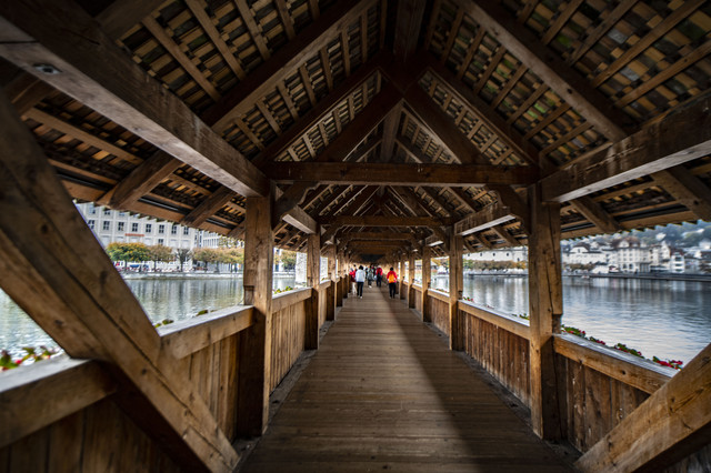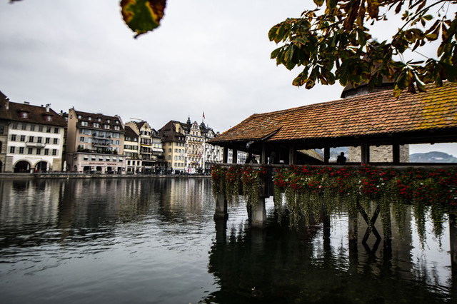 瑞士琉森最负盛名便是卡佩尔廊桥,又叫教堂桥,这是卢塞恩的标志,始建于1333年,也是欧洲最古老的有顶木桥,桥的横眉上绘有120幅宗教历史油画,沿途还可欣赏描述当年黑死病流行景象的画作。这座横跨罗伊斯河,长达200米的木桥。黄昏时在此漫步,仍可领略卢塞恩的一股浪漫的中古情怀。现今是卢塞恩明信片不可缺少的景物。每到初夏,木桥外侧就种满了天竺葵。