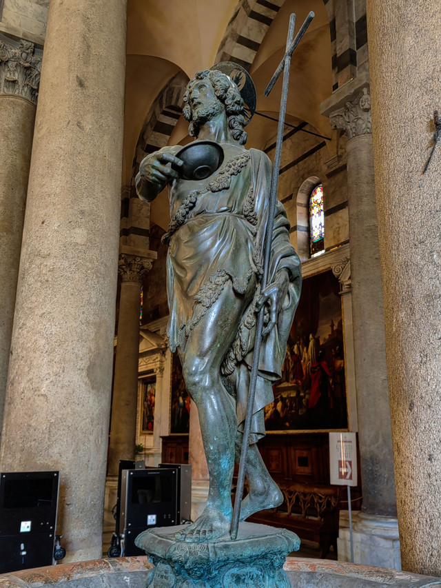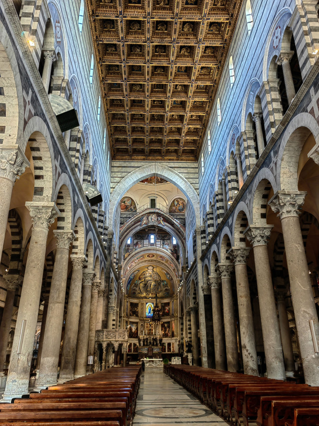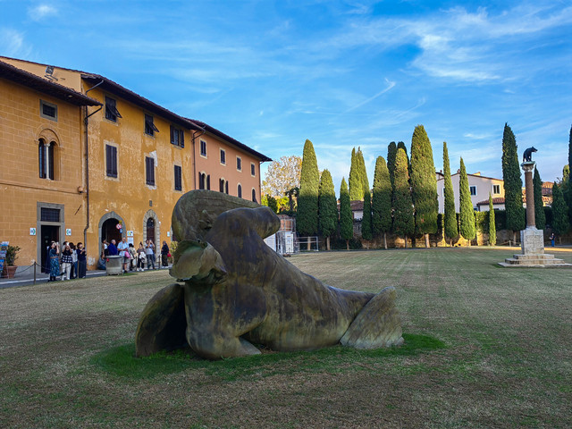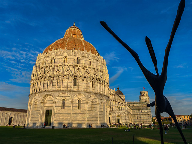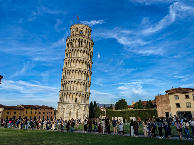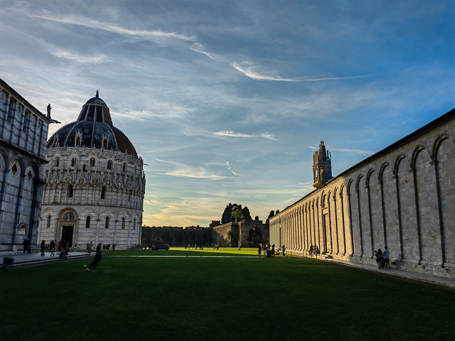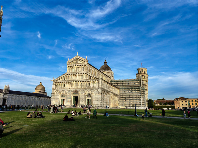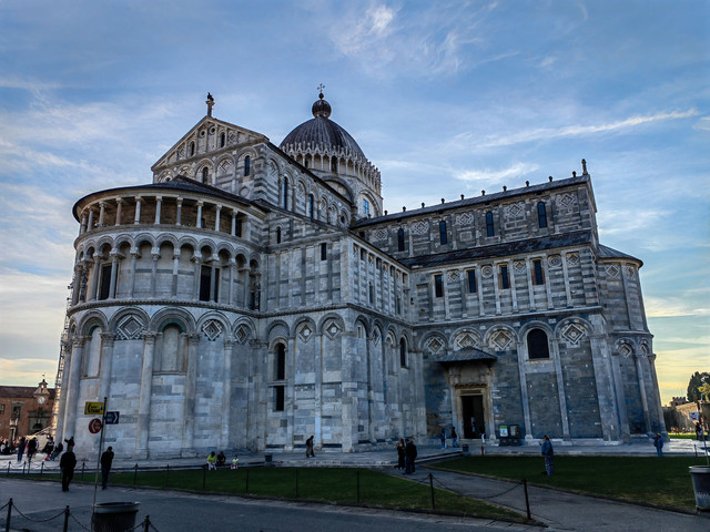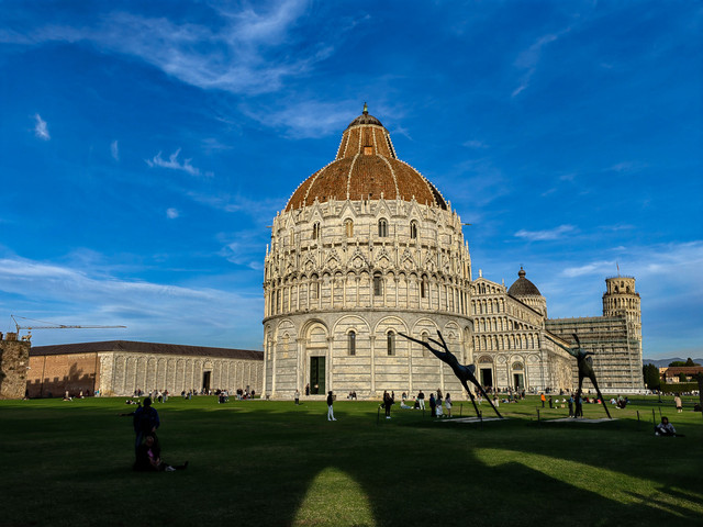 乘车前往比萨参观参观奇迹广场,它位于比萨城的西北角。奇迹广场是来比萨参观的重中之重,广场上的四大建筑——比萨大教堂、洗礼堂、比萨斜塔和墓园都堪称建筑史上的艺术杰作。该广场是中世纪艺术精华的中心之一。广场中心的比萨大教堂始建于公元12世纪,是中世纪罗曼式建筑的代表作,教堂内部的马赛克装饰又混合着拜占庭风格,形成了其独有的“比萨罗曼风格”。洗礼堂比萨大教堂的对面是洗礼堂,混合了罗曼式和哥特式的风格,沿着洗礼堂内部的旋转楼梯可以前往洗礼堂的中部参观。圆柱形结构、双层圆形屋顶和白色大理石材质使 得洗礼堂内部的音效更为美妙动听。