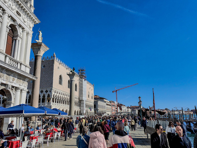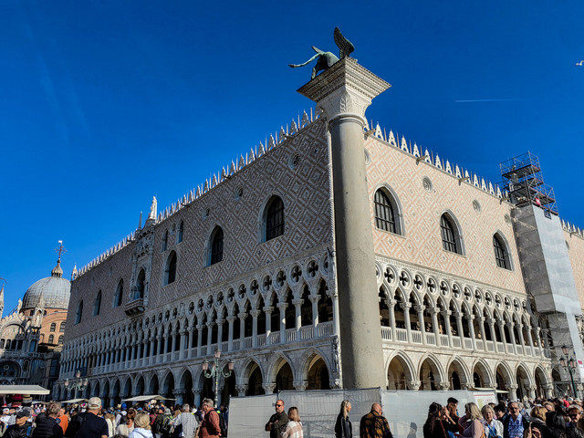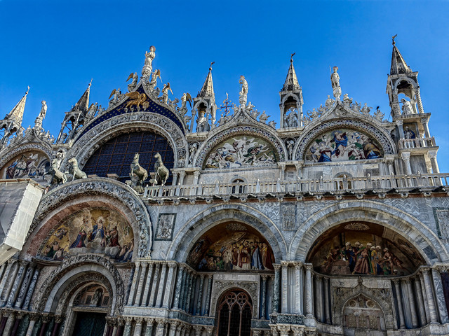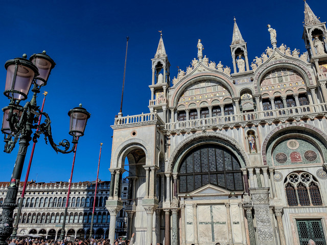 我们搭乘公共摆渡船,前往逐渐颓毁沉没的水上古都参观。参观有黄金教堂之称的圣马可大教堂,位于圣马可广场,与总督宫毗连的圣马可大教堂建于828年,因火灾在11世纪重建,起初只是用来安放圣马可的遗骸,其后用来收藏东征时期从各国掠夺回来的宝物。它曾是中世纪欧洲较大的教堂,是一座收藏丰富艺术品的宝库。
