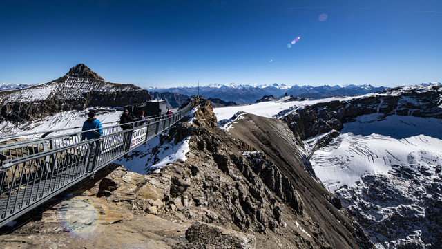 早餐后,乘车前往莱迪亚布勒雷,乘缆车(360度全景缆车)登上冰川3000,穿过世界首座连接两座顶峰的钢索桥到达天梭峰顶。站在山顶,可以眺望瑞士最著名的三大峰:勃朗峰、马特洪峰和少女峰,山顶的雪景让人仿佛置身于一个冰雪王国。远处的山峰连绵起伏,在阳光的照耀下闪耀着银色的光芒。