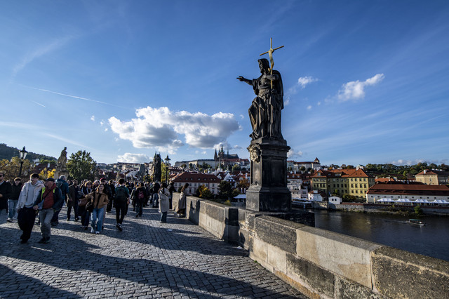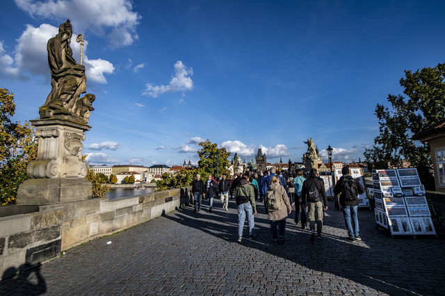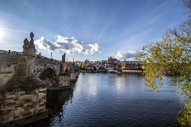 参观布拉格必访之地——浪漫的查理大桥,桥上30尊巴洛克式雕塑把平凡的一道石桥变成了一件吸引无数游客的艺术品。布拉格市是一个山清水秀的多桥之城,碧波粼粼的伏尔塔瓦河穿城而过,共有18 座大桥横架在河水之上,将两岸的哥特式、巴洛克式和文艺复兴式的建筑连成一体。其中,查理大桥是布拉格人在伏尔塔瓦河上修建的第一座桥梁,距今已有650 年历史。查理大桥以其悠久的历史和建筑艺术成为布拉格最有名的古迹之一。