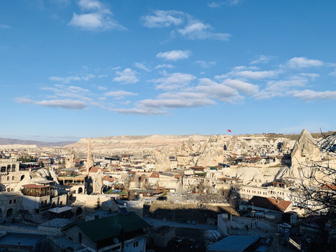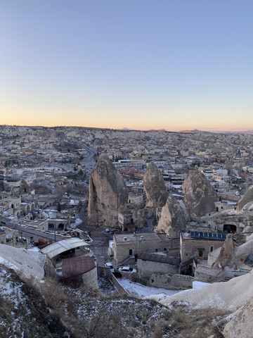 格雷梅小镇位于卡帕多奇亚,这里也就是土耳其最负盛名的旅游地了,这里云集了造型各异的仙人烟囱岩,被景色宜人的玫瑰谷、鸽子谷所环抱。对土耳其本身最大的期待应该就是飞屋环游记那种“最接近上帝视角”的热气球,可惜我们在卡帕多奇亚的那几天要么是下雪要么是刮风,到最后也没有体验到热气球,但也因此解锁了很多未曾好好感受的美丽风景。