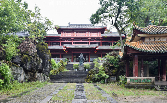 燕喜园里面最主要的建筑是刘禹锡纪念馆,大楼飞檐斗拱,采用朱红色的支柱,属于古典式宫廷建筑风格。楼前塑有诗豪刘梦得的青铜雕塑,右手提笔,左手执扇,仿佛正是他在此写下《陋石铭》的模样。“山不在高,有仙则名。水不在深,有龙则灵。斯是陋室,惟吾德馨……”,似乎是说,燕喜山不高,但是这里却出了一位神仙(廖冲),水(燕喜园的前面以前是海阳湖)不在深……