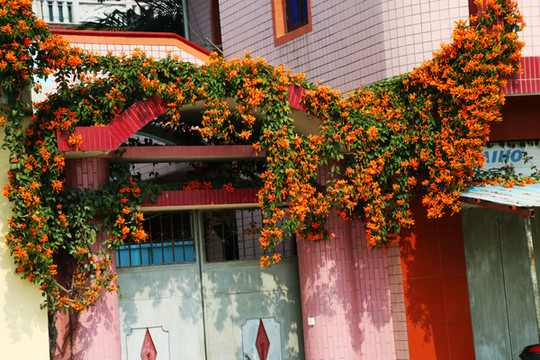 远远看见有户人家金光闪闪,冲过来才看清是门头上爬满了花,光耀门楣。我一度以为是福建特色的凌霄,一查,才知道这叫炮仗花。